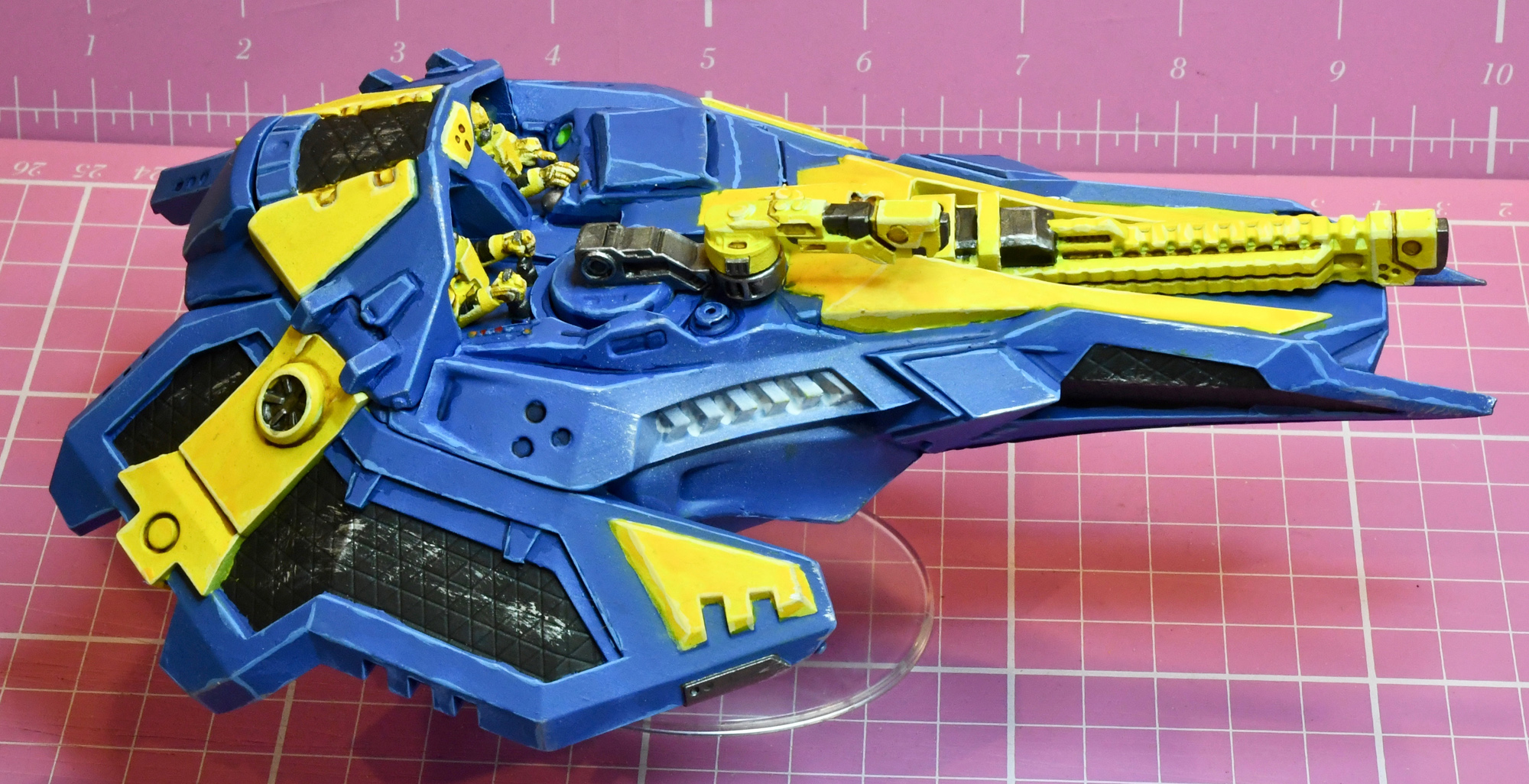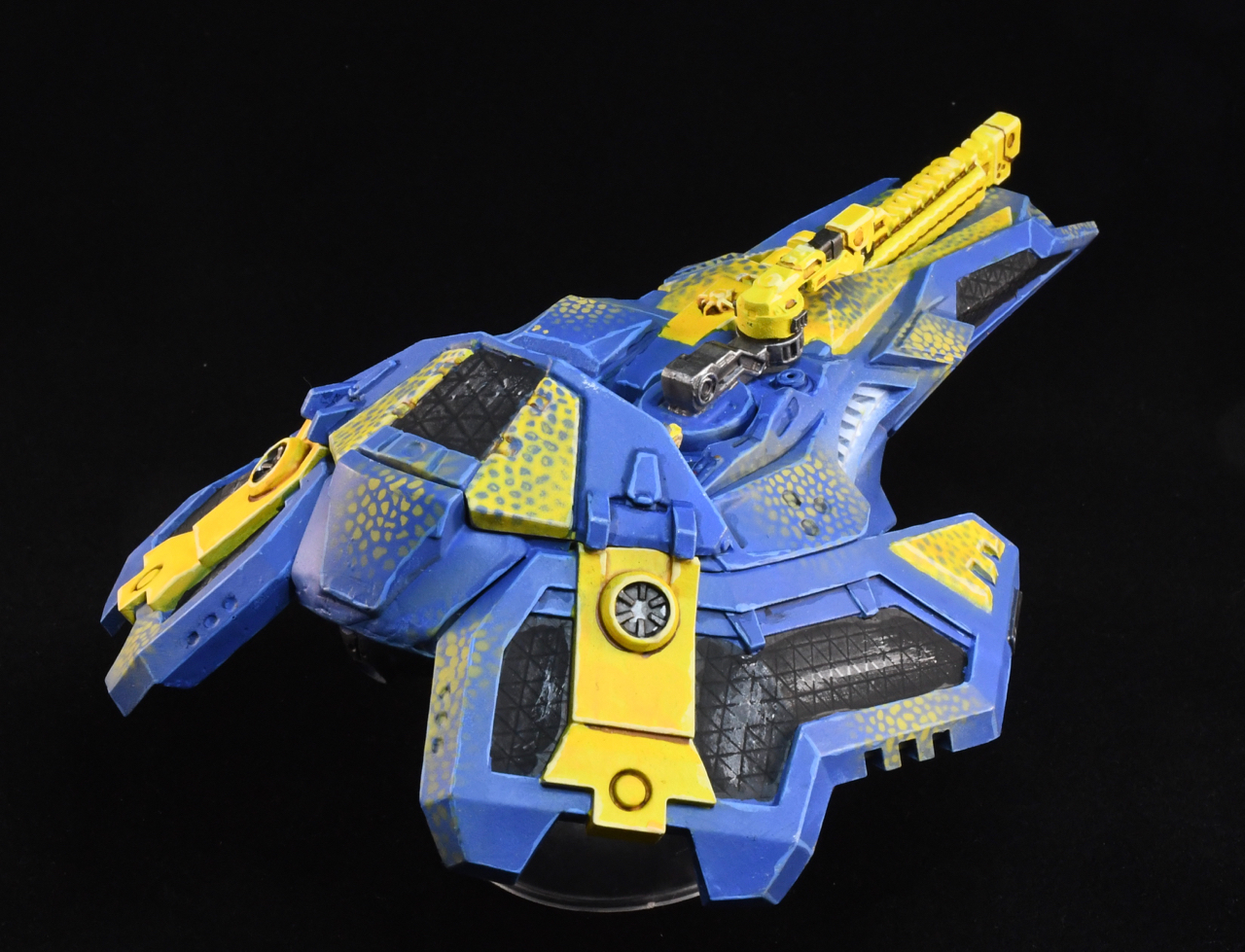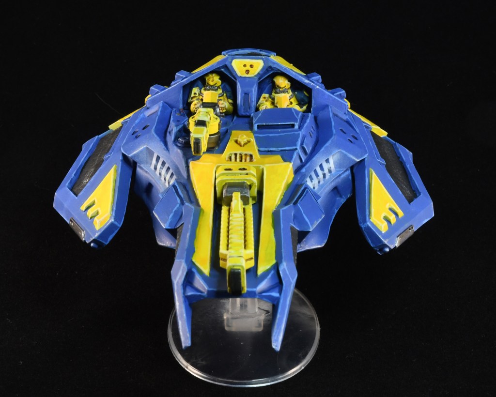 For speed the yellow sections were masked with paper and a mid blue acrylic added to the model with the airbrush. To complete the blue areas a wide brush (an Army Painter drybrush) was used to neaten the edges and fill any missed areas.