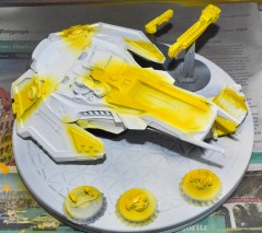 There are two different paint schemes for the Algoryn forces from Anakiri, a yellow/desert scheme and a dark blue alternative. This model became a blend of the two as yellow figures would contrast nicely with the blue. Past experience has shown that a white undercoat (standard white car primer) is a much better base for yellow colouring. An airbrush was used with a thinned acrylic yellow and after two coats a solid yellow was achieved.