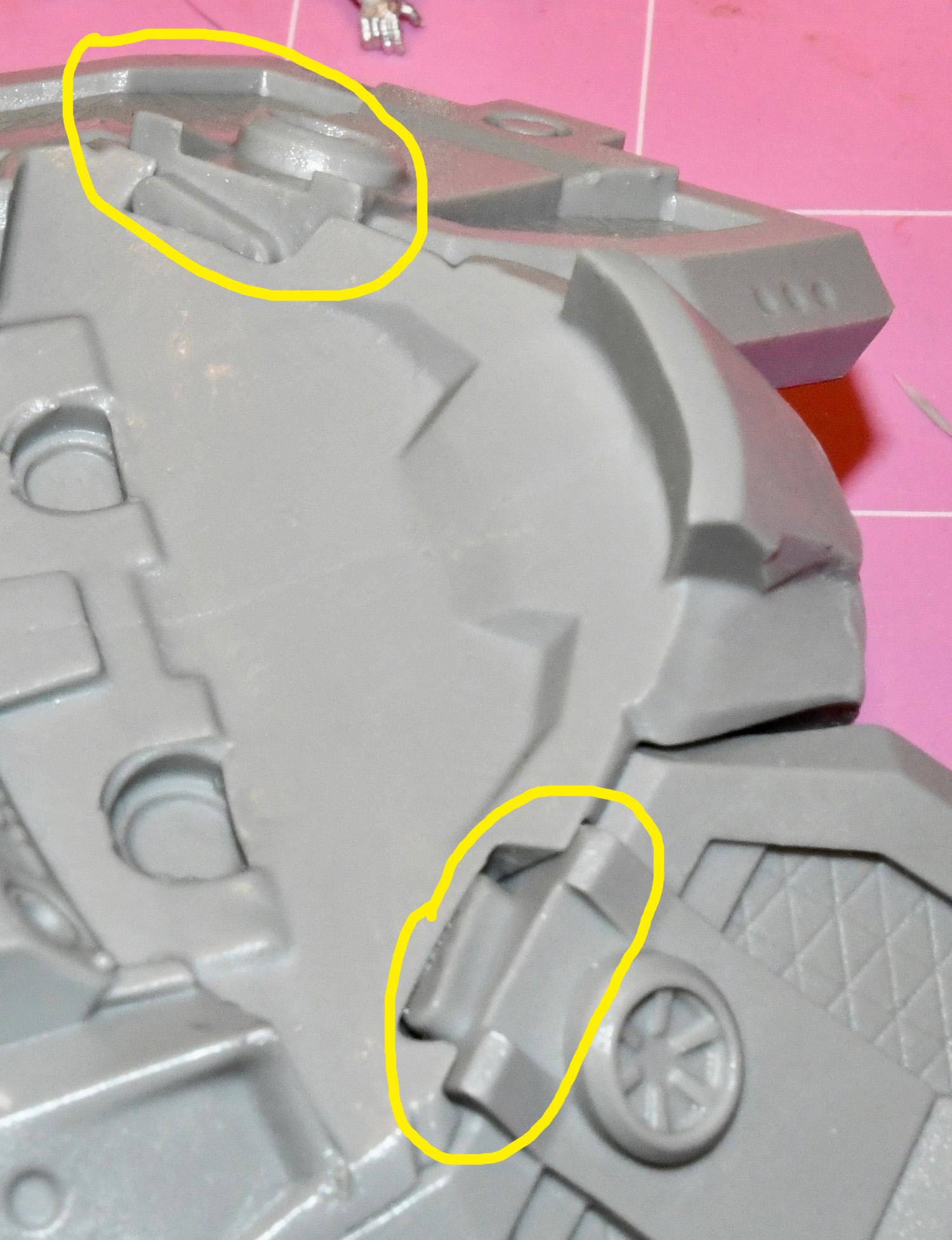 Both the resin and metal parts had some flash and mould lines but nothing significant, a light sand and the parts were ready to dry fit. The weapons located neatly on their mounts and the wings were also a good fit. However the locating tabs for the wings, circled in the image to the right, required trimming with a craft knife as they interfered with the fitting of the rear canopy.