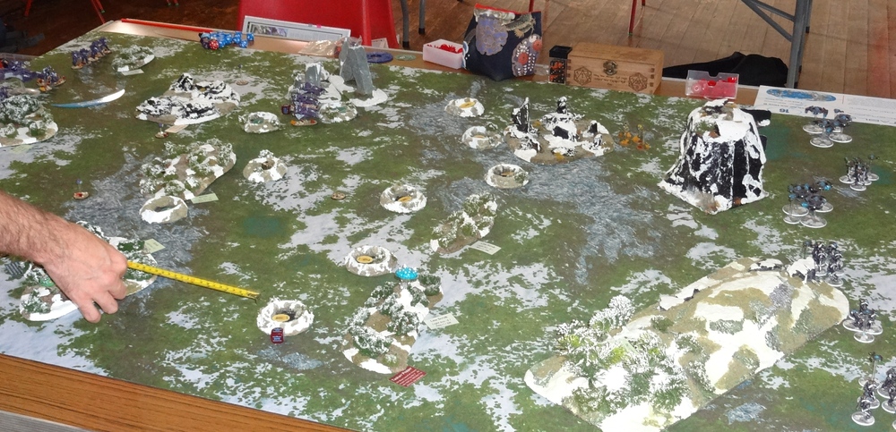 The game is run lengthways on a 6’x4′ table. For higher points, add width rather than length (so a 5′ wide by 6′ long table would be appropriate for high-end FL2 and even FL3 games, perhaps).