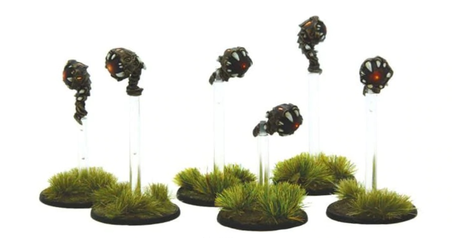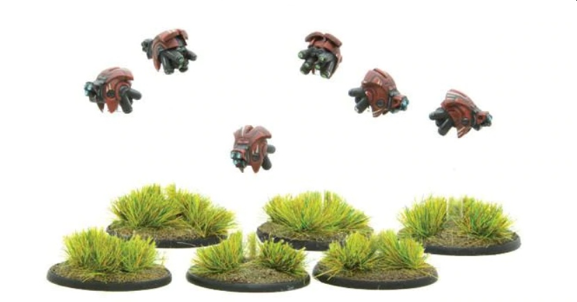 Probes normally have a Res of 5 and a move (M) of 10″, able to Run at double that distance, though they may not sprint. Being shards, they cannot receive some order dice due to events as they can only be given a Run order. Probes are nimble, so also bob out of the way of units trying to attack them hand-to-hand, so cannot be engaged in an Assault. Further, models in a sharded unit normally have to be targeted individually unless they are attached to an enemy unit or are within 1″ of each other.