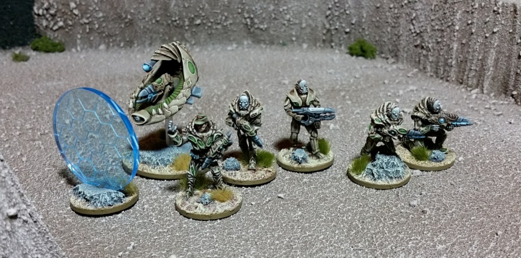 The D1, D2, Andhak and Nhamak weapon drones perform a vital function in their respective armies: a resilient, mobile weapons platform. Most often deployed singly, with shield, spotter and batter drones, they have long ranges and typically strike right across the table – especially with the plasma weaponry. Whilst the plasma light support (PLS) variants do not always take spotter drones, having a reasonable rate of fire (RF3) and good Accuracy (6), the heavy weapon drones with the plasma cannon almost always take spotters to give them a better chance of hitting their target.