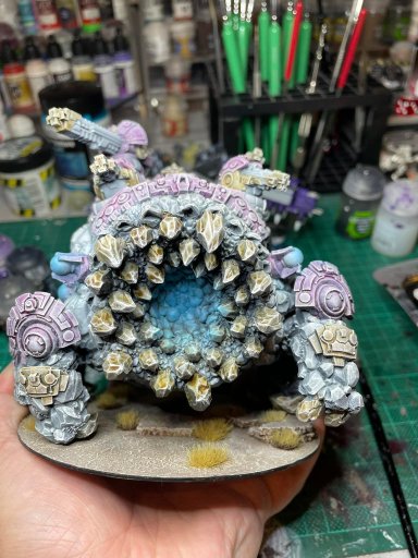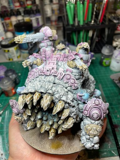 This particular matronite found a particularly rich vein of lapis lazuli (a deep blue metamorphic rock) which she found incredibly tasty and would not be moved until she had mined it out. Though she initially turned a rich, dark blue she is now reverting to her natural colour as the lapis leeches out of her system, and looks very different in different lighting – much like an ancient painting using the blue tint ‘ultramarine’. She is difficult to handle in battle, not because she is ‘ornary but simply because she would far prefer to be tunnelling through rock somewhere! Her names are varied, as a result, but most often she is referred to as “Agatha”.