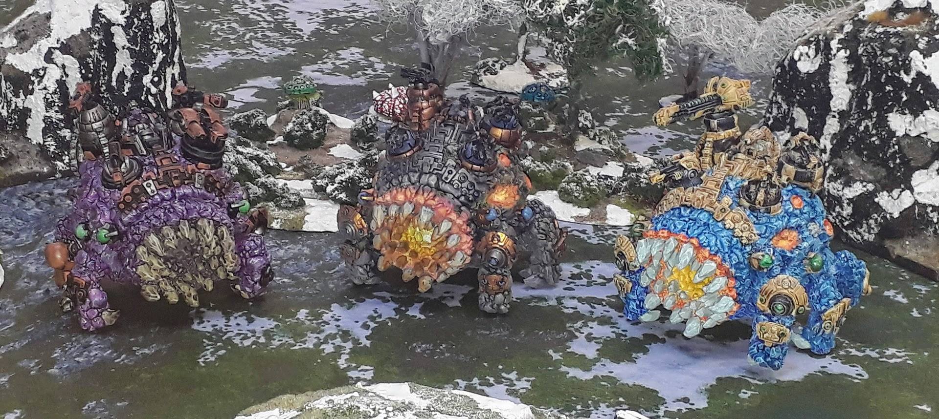 And at a recent tournament in Southampton, we saw three of the broodmothers all together. All were named, but we can’t reproduce all the names, here. Nonetheless, on a Taskarr Tundra table, they look pretty impressive!