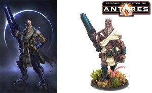 Togg Kin’Ru’s appearance combines elements of his background from the savage Cranogn tribe that raised him, to the sophisticated Freeborn armour and weaponry he has learned to master. His plasma duocarb is an adaptation of the Tsan weapon of the same name. He is protected by resharded armour suspended from plates and carrier nodes, and his body is naturally tough with enhanced healing abilities. He carries an enhanced warrior’s knife of the Cranogn, the symbol of a warrior amongst his adopted people,though its edge has been reforged by the best fabrication techniques Togg could find: it is now more precious to him than any ordinary weapon.