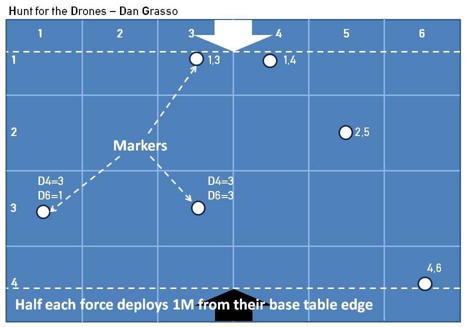 Set up terrain in the standard way as described in Playing the Game, then place the markers to represent to potential location of the surveyor drones.