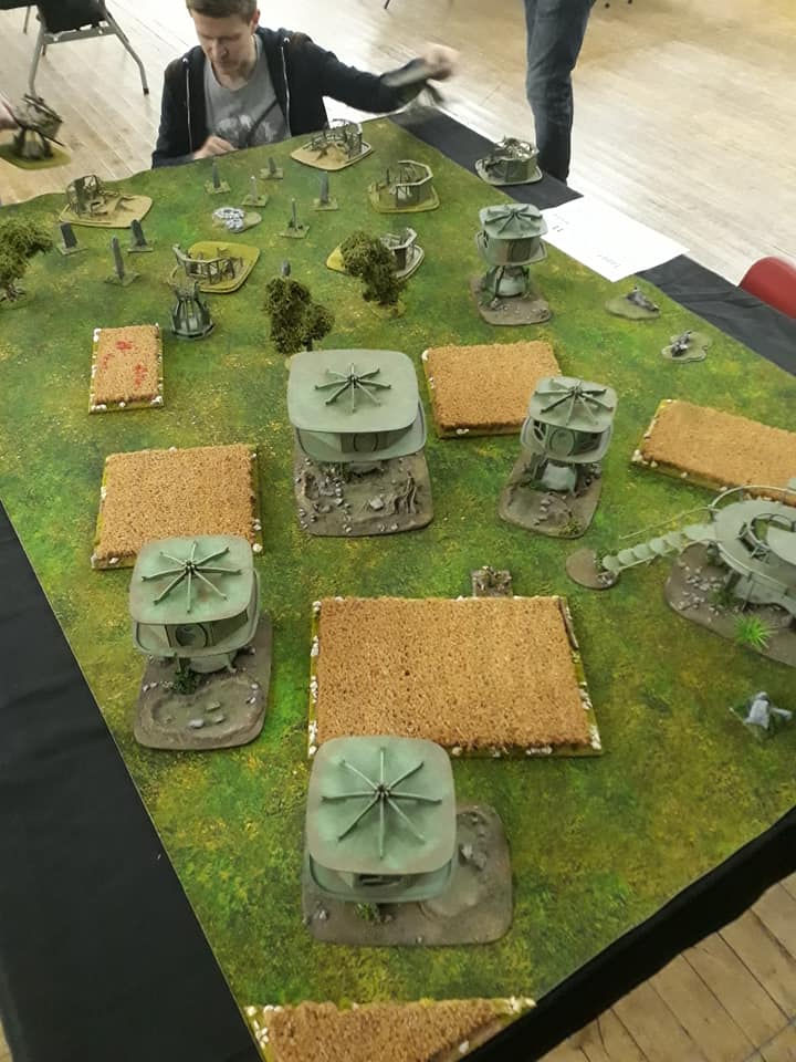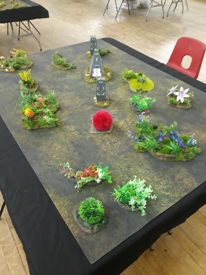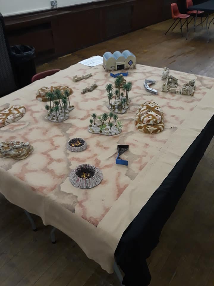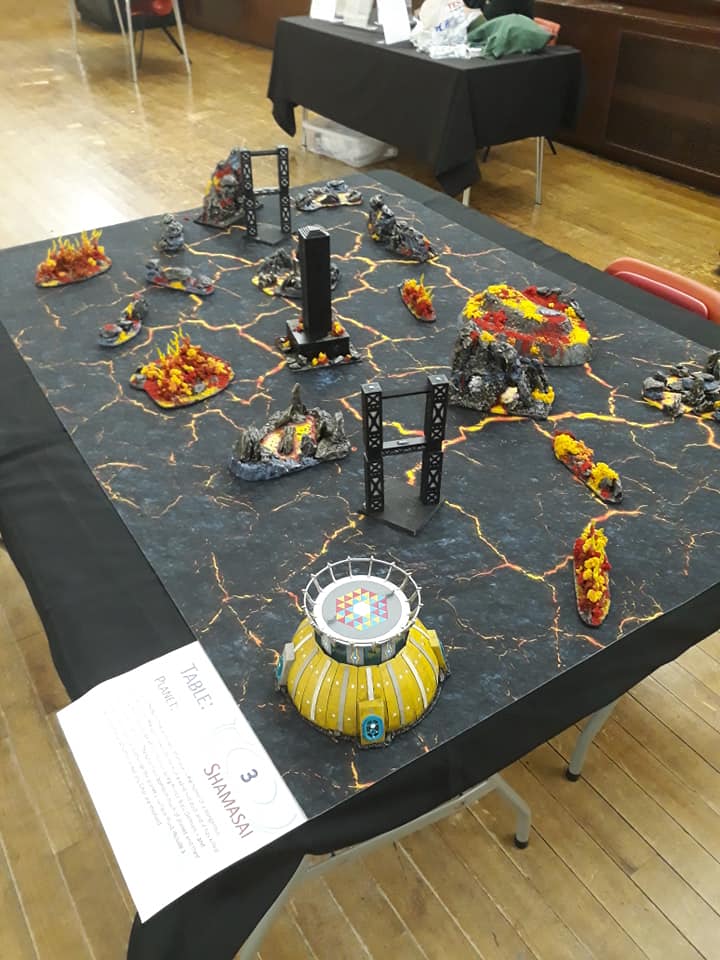 Most of the terrain was provide by me, supplemented by some of Warlords own Antares buildings and jungle terrain. Each table was set up differently to represent a different area on one of four planets: Shamasai, Dilexyon, Tolek and Taskarr – Shamasai and Taskarr having featured in previous supplements and fiction, of course. Each table had a label and its number, plus a short overview, and on each table we also placed a reference sheet with all the penalties and bonuses for the terrain on that table. This saved players hunting through the book for details on each type of terrain as there were a great many different terrain pieces used.