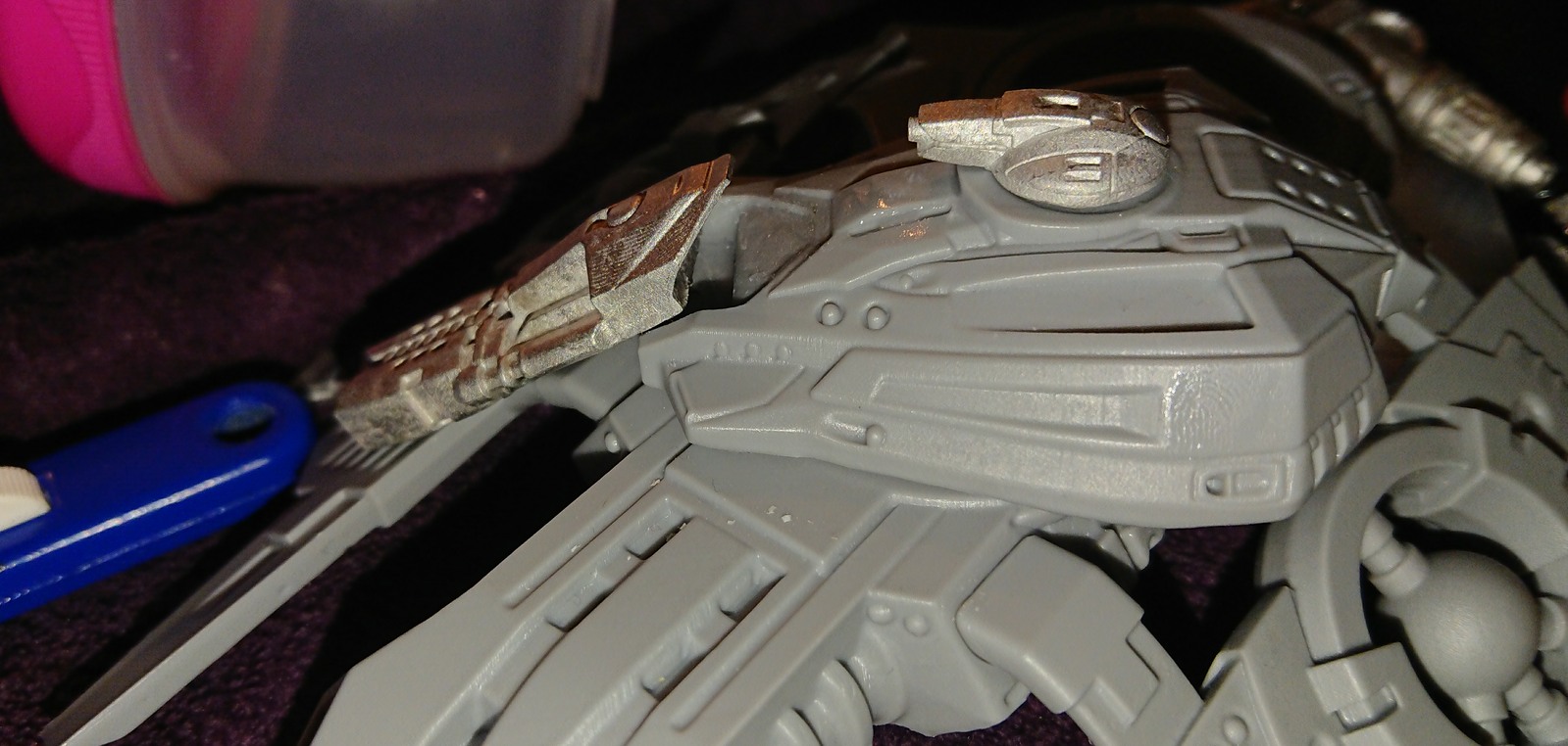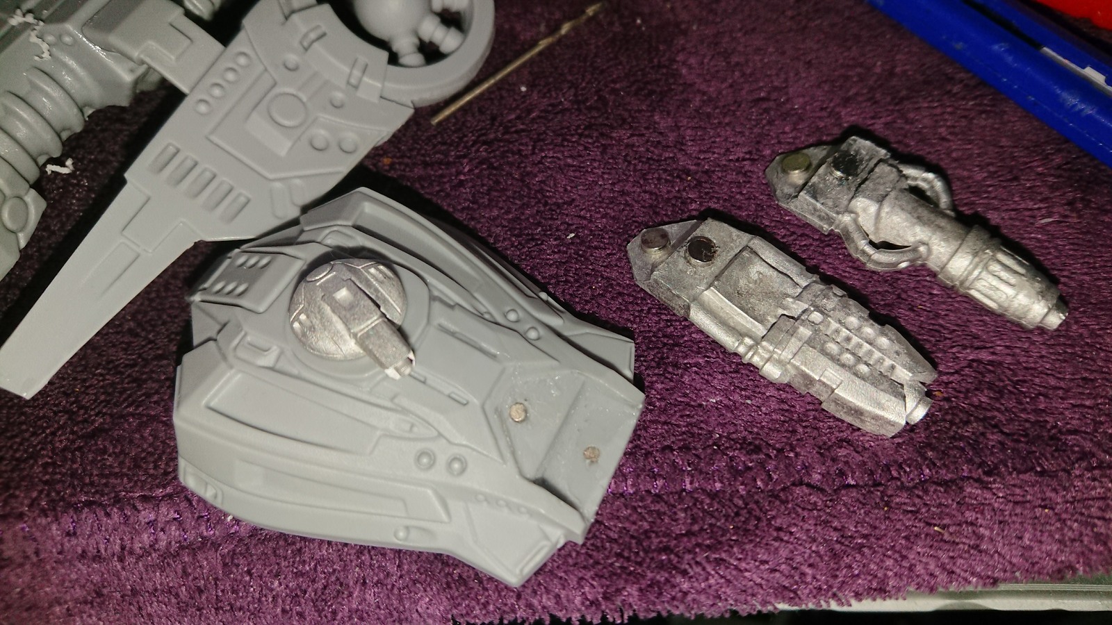 The single magnet would prove to be enough for the compression bombard to hold it in place with relative comfort, but it was not enough for the larger plasma bombard piece which was too heavy for the single magnet to hold. Instead, I decided to glue a second magnet on flatter slanted part of the gun and insert another magnet into the raised angular part of the turret. I did it to both Bombard pieces and this proved to be strong enough to hold both pieces in place, but it would fall out when turned which was a bit of a shame: next time I might use a larger more powerful magnet on the turret (and I’d probably want a more appropriately sized drill bit to have any success).
