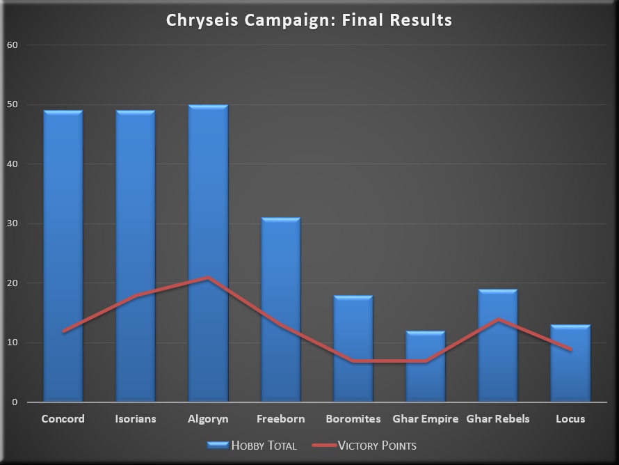 Whilst phase/scenario 3 (the Chryseis Bases) resulted in mixed results for the Concord, Isorians and Algoryn, scenario 4 saw some mixed attacker/defender combinations in which teh Isorians and Ghahr Rebels prevailed. Unfortunately, the Locus began to gain ground.