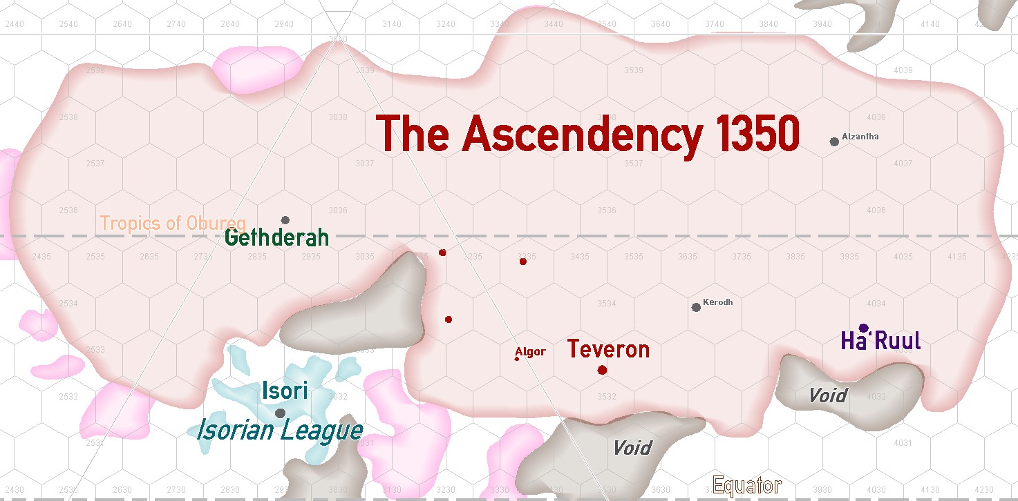 | 1380 | The Ascendency switches to an expansionist programme including the forcible annexation of nearby naval shipyards and poorly defended worlds. They use a wide mix of the Teveron legions, privateers, sub-contracted raiders, espionage and political means to ‘encourage’ fiefdoms to join. Derivar and other independent, specialist shipyards are particular foci of the expansionism. |