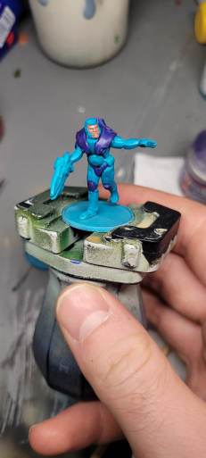 After my first game Jamie very kindly provided me with a C3 Strike Team sprue to build and paint, giving me a chance to pick a colour scheme before choosing my troops. With so many potential colour schemes that might work, it was a tough choice. Initially I thought about yellow and blue, but then remembered that painting yellow is a nightmare. If I’m going to paint dozens of infantry, I don’t want to be putting 7 or 8 coats on each one. So I ditched that idea and came up with a totally original blue and purple scheme that is 100% not based on Skeletor – that’s just a happy accident!