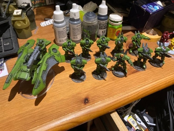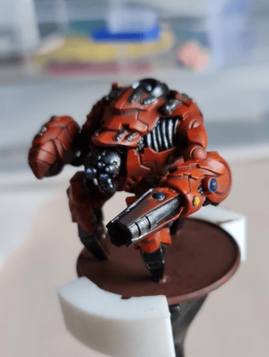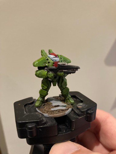 Initially I had planned to go with the ‘catalogue’ red paint scheme shown off on all the official images of the Algoryn but then I was watching a clip from the Halo franchise and I realised the Hazard suits would look pretty cool in a similar green scheme. I took about 5 attempts to find the right green and then a further 5 or so iterations of the scheme before I settled on the final version. The scheme is now Vallejo Olive Green as the main colour with Vallejo German Camo Dark Green as the under armour colour and then a Vallejo Light Grey helmet. I’m still working on a few parts and accent colours here and there hence a few inconsistencies in the photo. The basing is pretty standard sand and rocks with some tufts to be added later which will match my concord basing.