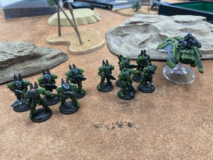 With my freshly painted troops, I headed down to Entoyment to play against Jamie and his Algoryn, hoping it might provide some insight for when I face Andy later in the campaign. We picked out 80pts each, both taking a turn as the attacker and defender in a “destroy the power generator” type custom scenario. It heavily favoured the defenders due to terrain and the placement of the objective, but swapping roles nullified any concerns I might have.