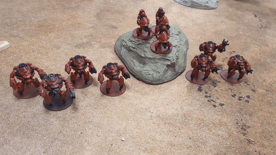 In my first game I got my butt kicked good and proper, but in doing so I worked out a few of the Ghar strengths and weaknesses. So, when it came time to select my units, I picked ones that would work to their strengths while playing down the weaknesses. The Ghar are good in toe to toe but not so great at ranged combat. With that in mind, my initial picks were an Assault squad and a Bomber squad. The former are good when they’re up close and personal, and while the Bomber squad are no slouches in hand to hand either, their real strength is bombarding the enemy at range. To support them I also picked an Attack Scutter quad – these are more manoeuvrable, cheap, and have the same guns as a standard battle suit. Not necessarily the best squad but they can react to changing circumstances. I already have my eye on a Bombardment Crawler for next month.